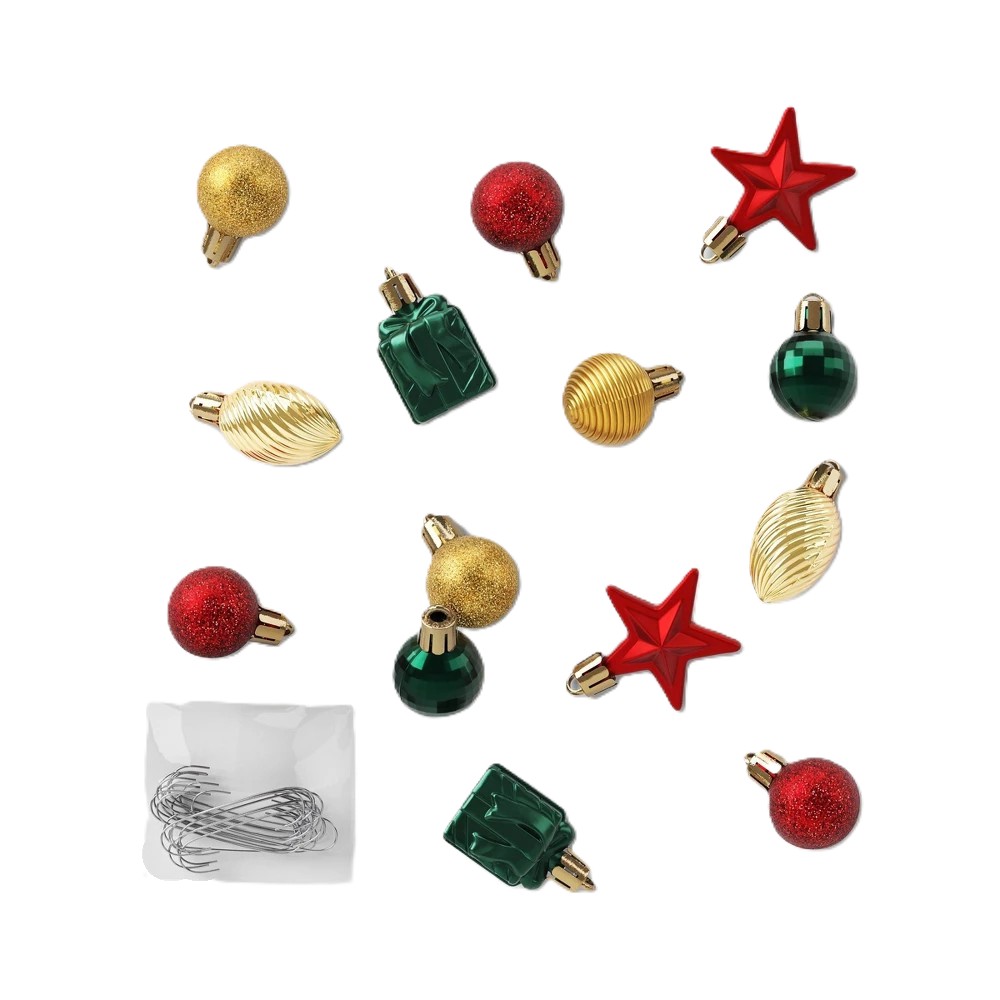 Deck your tree with festive sparkle using the Wondershop™ 25-Count Assorted Shatter-Resistant Ornament Set. Featuring a mix of red, green, and gold finishes, these durable, lightweight ornaments are perfect for adding vibrant holiday cheer to trees, wreaths, or garlands.