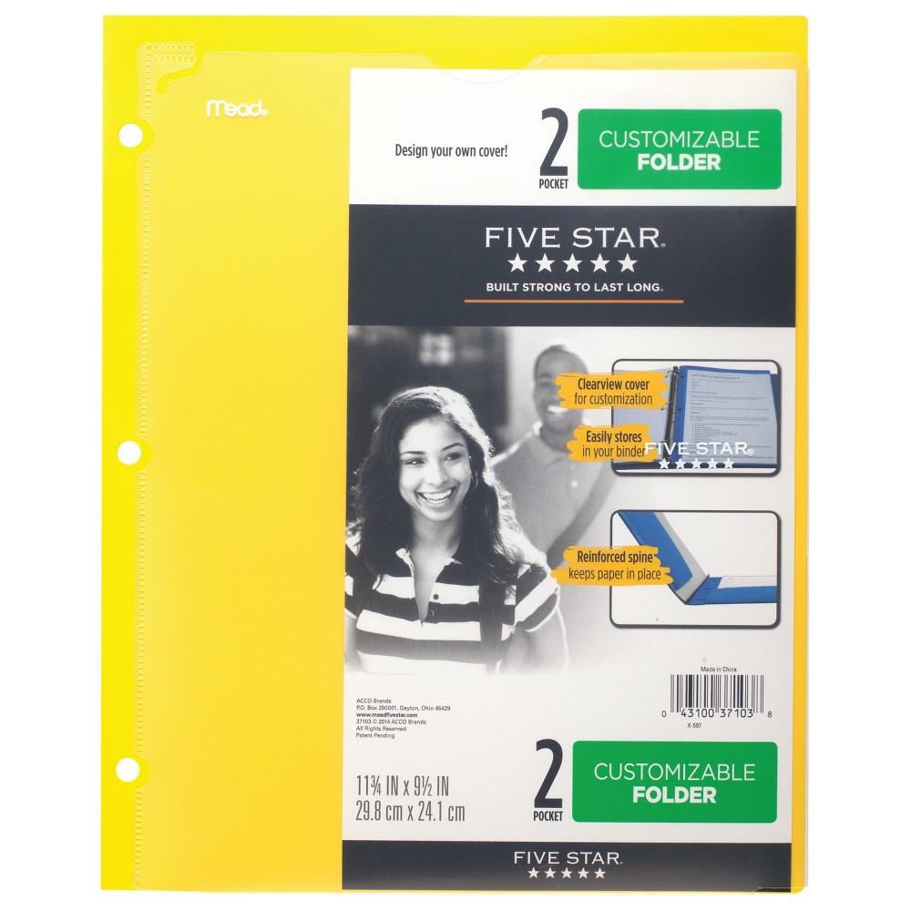 Organize and secure your documents with this vibrant yellow Five Star® folder. It features two pockets for loose papers and built-in prongs to hold punched sheets firmly in place. The clear customizable cover lets you personalize your folder for easy identification, while durable construction ensures long-lasting use.