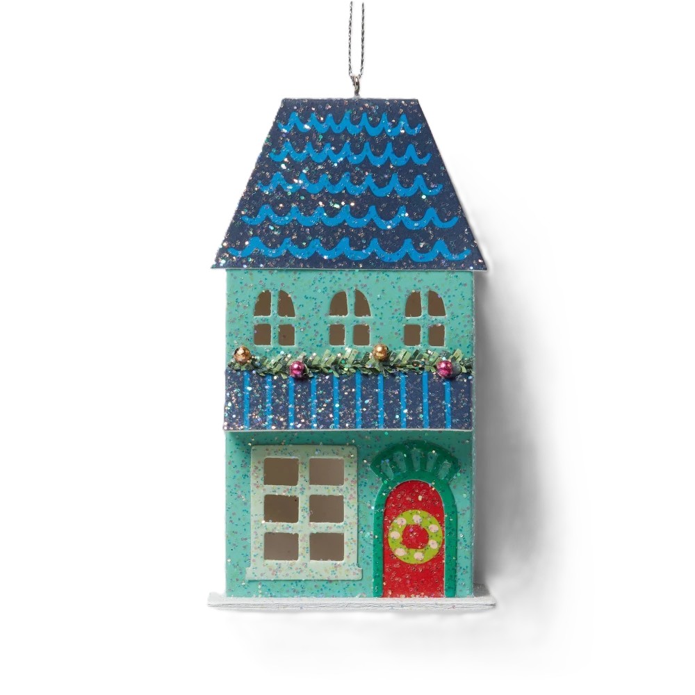 Add whimsical sparkle to your holiday décor with this charming green glittered paper house ornament from Wondershop™. Designed to shimmer on the tree, its festive house silhouette and dazzling finish catch the light for extra holiday cheer. Lightweight and easy to hang, this delightful ornament brings nostalgic Christmas magic to every branch.