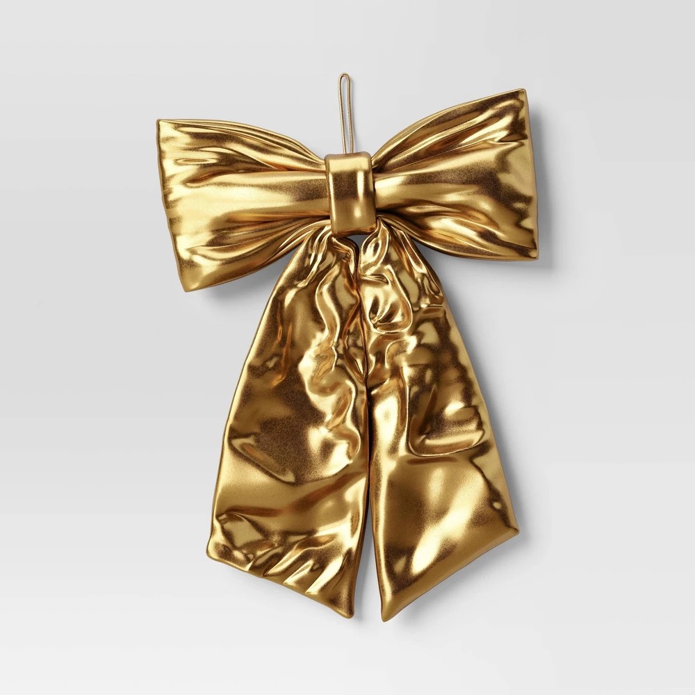 Add a touch of holiday elegance with this Large Gold Decorative Bow from Wondershop™. Perfect for wreaths, garlands, gifts, or front door displays, this statement bow features a classic shape and rich gold finish that instantly elevates any Christmas décor. Whether you’re going for traditional glam or modern sparkle, this versatile bow is the perfect finishing touch to make your holiday shine.