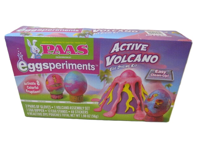 Get ready for an eruption of fun with the PAAS® Eggsperiment Active Volcano Egg Decorating kit. Dye your eggs by lowering them into the overflowing volcano and create amazing colorful eggs!