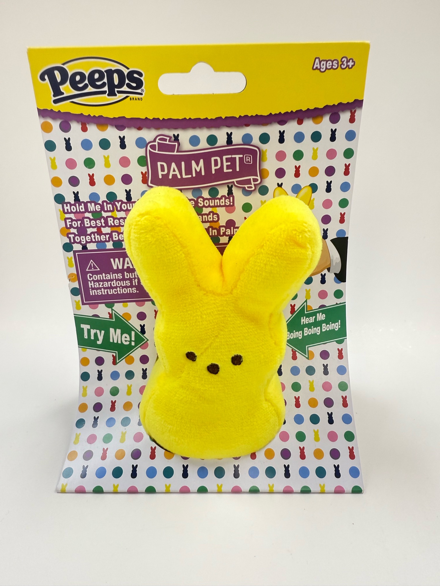 The Peeps Palm Pet is a soft, mini plush that fits perfectly in your hand—and it’s more than just cute! When you hold it, it makes a fun noise for an interactive surprise. For the best experience, rub your hands together before placing it in your palm and enjoy the magic. A perfect Easter basket addition or pocket-sized companion!