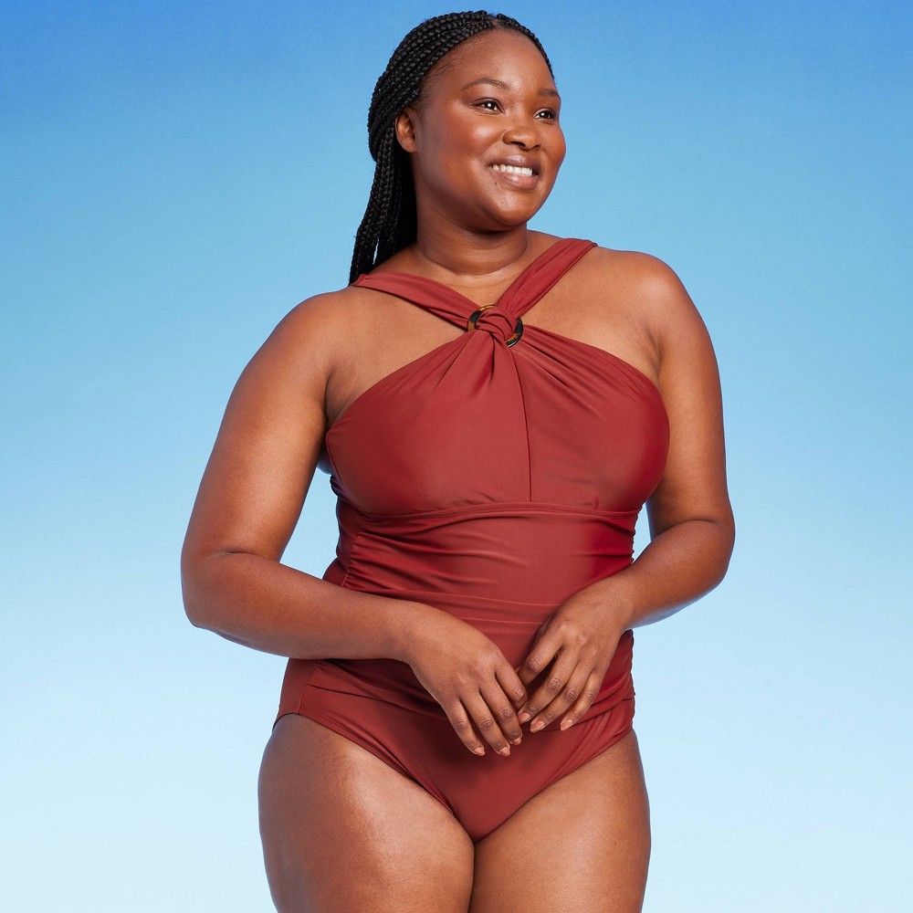 Women’s Ring Crossover Ruched Full Coverage One Piece Swimsuit – Kona Sol™ Red